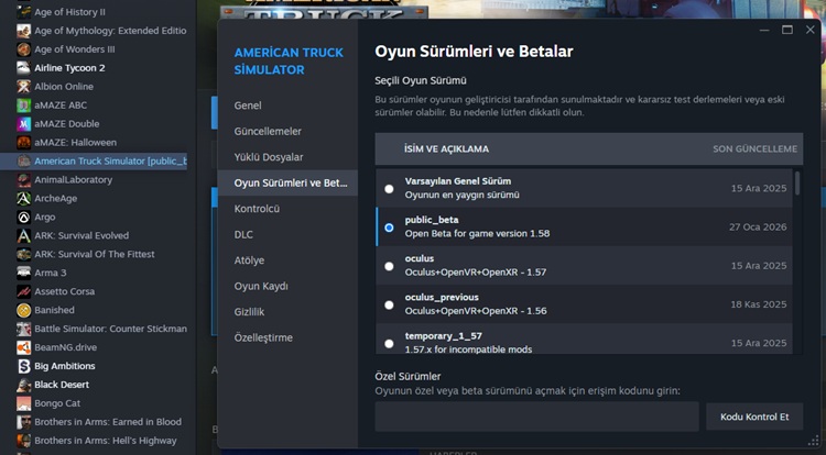 Küçük bir pencere açılacak. Burada Oyun sürümleri ve Betalar sekmesine tıklayın, public_beta 1.58 olanı işaretleyin. Oyun güncellenecek. Ardından 1.58 ile oynayabilirsiniz.