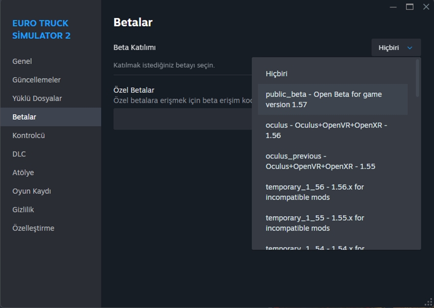 Euro Truck Simulator 2’nin bir sonraki güncellemesi 1.57 Steam oyuncularına sunuldu. Steam kütüphanenize giderek, Euro Truck Simulator 2’ye sağ tıklayın ve özellikler diyin. Ardından açılan pencerede betalar kısmına tıklayın.